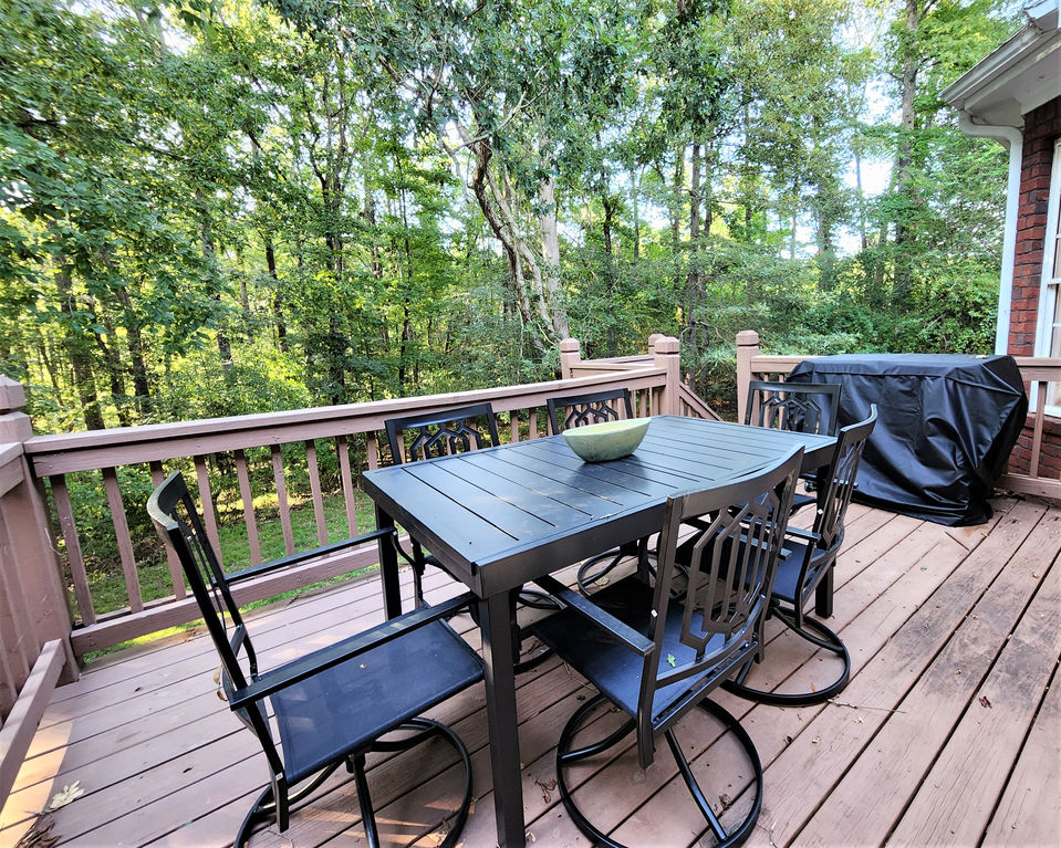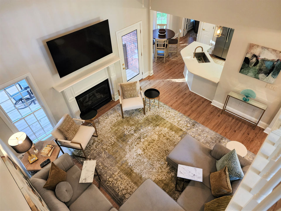 This COMPLETELY UPDATED house is nestled in an upscale, quiet neighborhood that is still close to the action of Athens. Almost everything is new-bathrooms, kitchens, floorings, electrical and plumbing fixtures, AND all new luxurious furnishings. The home has 3 floors, each having its own living room/ gathering space. The main level is a world unto itself with a spacious master suite, a designed-for-comfort living room, open flowing kitchen, study and a separate dining room. A gas fireplace, big mantle-mount Smart TV, and a dining deck add to its inviting feel. The huge daylight lower terrace level has its own full kitchen, full bathroom, media room/ sleeper den, king bedroom, and a large gathering area with dining seating for 12. This rec area has a pool table, foosball table and lounge seating, all in view of the 85" SmartTV. Walking out into the private backyard there is a patio with courtyard side walls, all with a private wooded view. The top floor has 2 more king bedrooms as well as another bedroom/ den with a sleeper/ chaise. One full and one half bath are also on this floor.